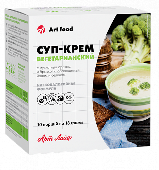 Суп-крем «Вегетарианский» приготовлен по всем канонам вегетарианской кухни. В него входят только натуральные растительные ингредиенты: картофель, лук, морковь, брокколи, петрушка, приправы. При минимальном количестве калорий этот продукт сочетает максимум пользы для здоровья, так как обогащен йодом и антиоксидантами.